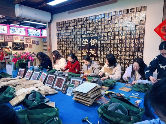 上午大家统一乘车出发,一路欢声笑语抵达犁桥水镇。在铜徒学堂手工体验区,一场充满文化底蕴的非遗铜拓DIY正式开启。专业老师现场讲解铜拓文化、演示工具使用与制作步骤,女职工们认真聆听、细心实操,在轻薄铜箔上拓印吉祥纹样,指尖流转间完成一件件兼具纪念意义与文化内涵的作品,现场氛围温馨而专注。作品制作完成后,大家手持成品合影留念,用匠心定格节日美好。