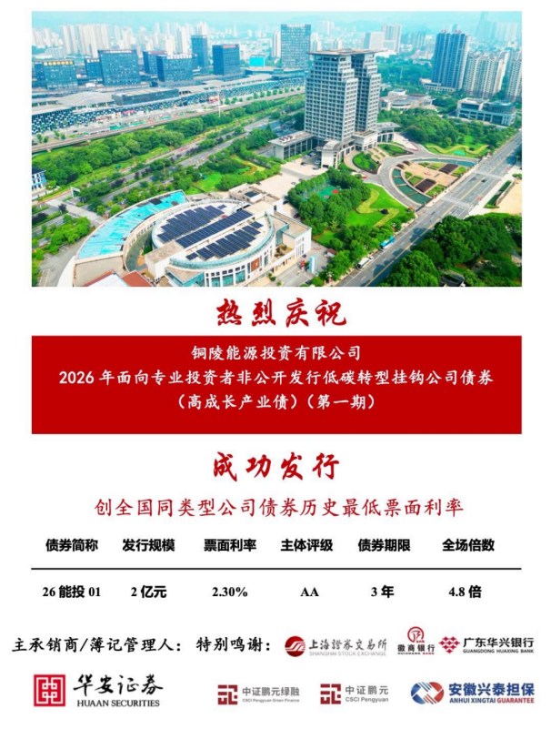 本期债券的成功簿记是对接资本市场、创新融资模式的重要举措。债券以低碳转型为核心导向,设置关键绩效指标,挂钩票面利率调升机制,精准引导募集资金投向光伏等绿色能源项目,助力提升我市清洁能源装机容量。同时叠加高成长产业债属性,优化信息披露与投资者保护机制,充分发挥资本市场对实体产业的赋能作用。铜陵能源投资有限公司将积极引入金融活水,为我市能源结构优化、绿色产业升级及高成长产业项目建设提供坚实资金保障,彰显地方国企践行绿色发展理念、服务地方经济高质量发展的责任担当。